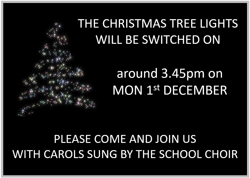 Please join us for the Christmas Tree Lights switch on, at the War Memorial site, on Monday 1st December at 3.45pm, accompanied by singing from the Primary School Choir.
